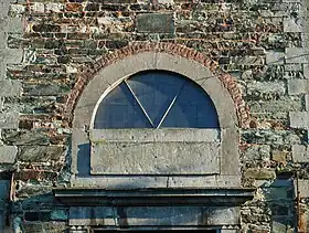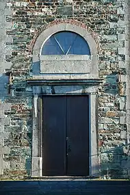 La base du clocher est percée d'un portail de style classique en pierre bleue présentant pour toute ornementation un motif de gouttes à la verticale des piédroits. Ce portail est surmonté d'une baie en demi-lune[1] sous double rouleau de brique et d'une meurtrière.