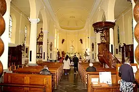 L'église présente un intérieur lumineux peint en couleur crème, les ornements comme les chapiteaux et les corniches étant peints en blanc.