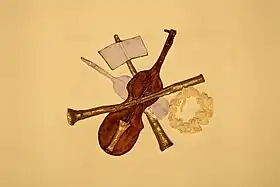 Juste devant les orgues, le plafond de la nef est orné d'un motif peint et en relief figurant des violons, des hautbois, un pupitre et une couronne de fleurs.