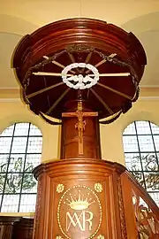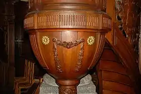 La chaire de forme circulaire, à laquelle un escalier tournant donne accès, est surmontée d'un abat-voix orné de la représentation du Saint-Esprit entouré de nuages et de rayons de lumière, et décoré de guirlandes et de nœuds.