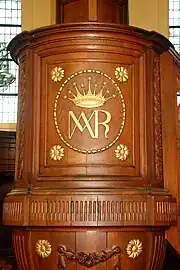 Sa cuve est décorée d'un écusson frappé d'une couronne et des lettres « A » et « M » entrelacées, résumant la formule latine « Auspice Maria » que l'on peut traduire par « Sous la protection de Marie », suivies de la lettre « R » pour « Regina » (Reine). cet écusson est entouré de quatre rosettes dorées.