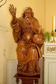 À gauche de l'autel se dresse une imposante statue en chêne de Dieu le Père bénissant de la main droite et retenant de la main gauche l'orbe posé sur ses genoux, un globe coiffé d'une croix symbolisant sa domination sur le monde.