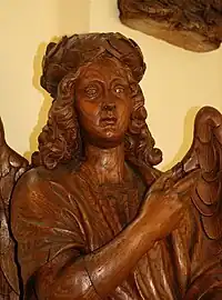 Plus en avant se dressent, à gauche et à droite, deux belles statues en chêne figurant des anges coiffés de couronnes de laurier et habillés de toges au drapé élégant.