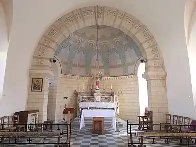 La voûte en cul de four du chœur est décoré de peinture de Gustave Riquet représentant des anges soutenant une couronne céleste au sommet, les lettres grecques alpha et omega symbolisent la présence divine.