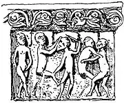 « Au milieu, est une femme entièrement nue dont les seins et les parties sexuelles sont très apparents ; elle a les mains attachées sur le ventre avec des cordes qui lui passent entre les jambes. Deux hommes entièrement nus et qui paraissent avoir des cornes se la disputent, l'un la tire par les cheveux, l'autre par les pieds : ils sont remarquables par la longueur et la grosseur de l'attribut de la virilité. »