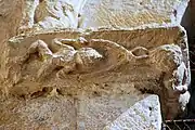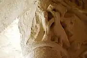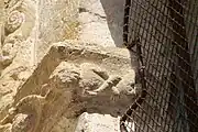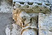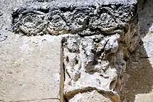 Les deux corbeilles à deux faces et les tailloirs qui les abritent sont très dégradés par l'érosion et par les couches de badigeon.