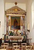 - d'un corps encadré de deux colonnes à chapiteaux corinthiens, cannelées dans les deux tiers supérieurs, d'une contre-table centrale occupée par un tableau, de deux ailes obliques à une travée de deux niveaux. La partie basse des ailes en retour, en lambris, s'ouvre par des portes et la partie haute reçoit deux statues reposant sur des consoles.