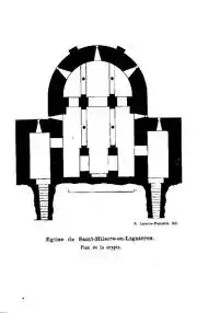 Avec un clocher carré avec contreforts aux angles conciliant des éléments romans et gothiques, l'église paroissiale possède notamment une crypte sous le chœur. Deux escaliers y donnent accès, ayant leur ouverture dans chacun des transepts. Chacun des escaliers aboutit à un couloir formant vestibule d'entrée de chaque côté de la crypte. La crypte proprement dite est à trois nefs. Les deux nefs latérales sont réunies à l'ouest transversalement par une galerie, en arrière des deux travées principales de la crypte. Chacune de ces travées principales est divisée en deux par une colonne supportant les arcs latéraux. Les trois nefs et les dépendances de la crypte sont fermées par des voûtes en berceau plein cintre surbaissé, parallèles au grand axe[2].