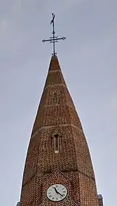 Le monument est construit en brique sur un soubassement de grès. Les ouvertures sont soulignées par un encadrement de pierre. Le plan s'éloigne du plan basilical traditionnel mais conserve les trois éléments : nef, transept et chœur. La façade est percée d'un portail protégé par un auvent décoré d'un crucifix. Une large baie vitrée surmonte le portail. Un clocher-tour flanque l'entrée côté sud. La particularité architecturale de ce clocher, qui culmine à 36 m de hauteur, est sa flèche qui prend la forme d'un obus - cas unique en France - rappelant ainsi les ravages de la Première Guerre mondiale dans ce secteur[2].