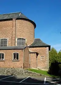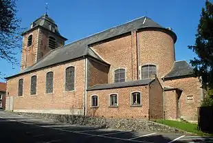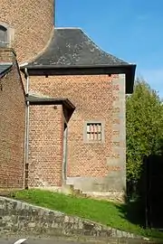Le chevet est prolongé dans l'axe par une petite sacristie de plan carré réalisée dans les mêmes matériaux et percée de petites fenêtres carrées à encadrement de pierre bleue, dont l'axiale possède des montants à deux harpes[3]. Au sud, le chevet est partiellement caché par une seconde sacristie, plus basse et plus récente[3].