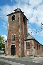 Le clocher en briques comporte quatre niveaux[3] et présente sur toute sa hauteur des chaînages d'angle en pierre bleue ainsi que de nombreuses ancres de façade.