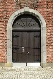 - un portail en pierre bleue à impostes et clé d'arc saillantes[3], à encadrement mouluré et tympan au motif rayonnant ;