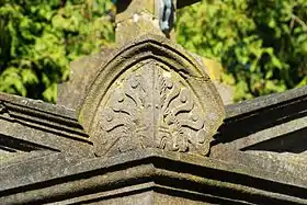 Un grand fragment de dalle brisée gisant dans la pelouse, au nord de l'église, est orné d'un bas-relief figurant un calice.