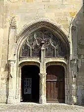 Le portail de gauche est entouré de deux voussures délimitées par des arêtes saillantes. La voussure inférieure se poursuit sur les piédroits ; la voussure supérieure retombe sur deux blocs de pierre bruts, et est surmontée d'une accolade ébauchée. Il s'agit vraisemblablement des résultats d'une restauration inaboutie. Plus intéressant est le portail de droite, dont le remplage du tympan ajouré a déjà été signalé. Le trumeau séparant les deux portes en anse de panier est décoré de clochetons plaqués sur sa partie inférieure, et porte une console sculptée de feuillages. Elle servait de support à une statue aujourd'hui disparue. Cependant, la niche destinée à l'abriter se limite à un pilastre creusée d'une moulure concave amorti par une coquille Saint-Jacques (motif récurrent qui ne constitue pas une référence au chemin de Saint-Jacques de Compostelle), et coiffé d'un petit gâble aux rampants garni de crochets, en lieu et place d'un dais flamboyant finement ciselé que l'on attendrait à cet emplacement. À l'instar de son pendant au nord, le portail est entouré de deux voussures, dont la voussure inférieure s'interpénètre avec celles qui surmontent les deux portes. Ce n'est qu'au-dessus des portes que les voussures sont sculptées de feuillages. À gauche et à droite, le portail est flanqué de deux pinacles plaqués assez rudimentaires, qui comportent des consoles du même type que sur le trumeau. Les niches à statues qui suivent sont ici plus larges, également terminées par une coquille Saint-Jacques, et surmontées d'un gâble garni de crochets, dont la surface est couverte d'écailles. Ces gâbles sont également d'une certaine originalité, comme le remplage du tympan[10].