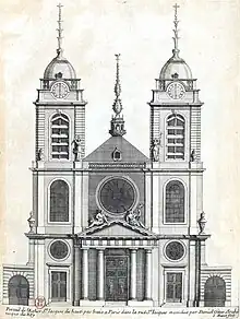 Les travaux peuvent donc reprendre en 1675 grâce à elle. L'architecte sélectionné Daniel Gittard, qui a entre autres déjà construit le chœur de l'église Saint-Sulpice, exécute des plans de la façade. Mais celle-ci ne sera pas exécutée complètement selon ses plans. Des deux tours prévues par Gittard, une seule est finalement construite, mais avec un étage supplémentaire.