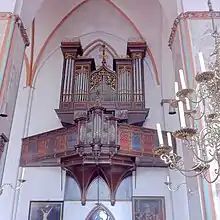 L'orgue du mur occidental date de l'époque gothique, mais est maintes fois agrandi depuis l'époque baroque. Le petit orgue, plaqué sur le mur Nord, en "Nid d'Hirondelle", date de 1467 et est reconstruit par Friedrich Stellwagen en 1636-1637.