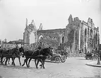 - « Façade de l'église Saint-Jean, à l'angle de la rue Saint-Jean et de la place du Commandant Louis Daudré, au débouché de la rue Saint-Fursy, en ruine après le bombardement de 1918 - voir sur Gallica »