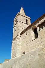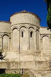 Le chevet, édifié en pierre de taille, a été surélevé en moellon lors de la fortification de l'église. Le soubassement d'origine de l'abside et de ses absidioles est maintenant caché par un empâtement de maçonnerie à l'esthétique très discutable rendu nécessaire par l'abaissement du sol de la rue[3].