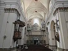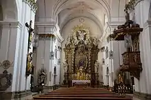 Au-dessus des chapelles latérales, un entablement coudé, qui n'est interrompu que sur le mur Ouest, entoure toutes les parties principales de l'église. Il semble être soutenu par des doubles pilastres avec des chapiteaux corinthiens placés devant les pilastres. Au-dessus de l'entablement se trouvent les fenêtres encastrées dans les capuchons des lancettes. Le transept, également équipé d'autels, et le chœur, qui contient le maître-autel, ont la même hauteur que la nef et ont également des fenêtres à la même hauteur. Le chœur, qui est séparé de la nef par un banc de communion, n'a qu'un seul joug et une extrémité droite.