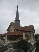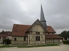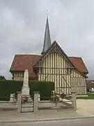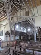 Elle possède une charpente visible de l'intérieur, une grande flèche, plusieurs retables et quelques statues.