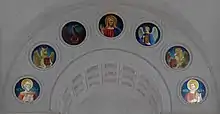 Les médaillons de l'arc triomphal ont été mal restaurés dans les années 1960. Ils représentent le Christ et ses témoins. De gauche à droite : saint Just, saint Luc, saint Jean, le Christ, saint Matthieu, saint Marc et saint Alexandre.