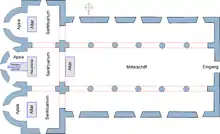 L’église de l'abbaye est installée dans une salle à trois nefs. La salle était accessible à l’ouest par une porte monumentale.