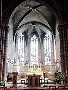 Les chapiteaux de la nef sont dépourvus de décors excepté à l'entrée du chœur. Un des vitraux situé dans le chœur illustre l'assaut des Armagnacs sur Guebwiller en 1445[6].