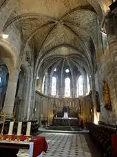 Depuis le transfert du maître-autel dans la croisée à la suite de la réforme liturgique issue du concile Vatican II, le chœur proprement dit n'est habituellement plus utilisé. Sa première travée carrée est des mêmes dimensions que la croisée du transept. Elle est bordée par deux longs rangs de stalles, au nord et au sud. Sa seconde travée, qui comporte une partie droite et l'abside polygonale, est habillée de boiseries peintes, et abrite notamment l'ancien maître-autel richement décoré. Au sud de cette travée, une porte à double vantail intégrée dans les boiseries donne accès à une seconde sacristie. Le chœur est donc dépourvu de collatéraux, mais la travée droite communique au nord avec la chapelle de la Vierge, moyennant deux grandes arcades en cintre surbaissé, retombant au centre sur une colonne cylindrique libre. La travée droite est ainsi subdivisée en deux demi-travées, comme le veut sa voûte sexpartite. Son doubleau intermédiaire retombe sur des culs-de-lampe de la forme d'un chapiteau de feuillages. Le voûtement sexpartite crée latéralement des formerets hauts et aigus, ce qui permet de pousser plus haut les fenêtres. Ainsi, le seuil des deux fenêtres hautes du sud se situe effectivement au niveau des chapiteaux de la voûte. À l'instar des fenêtres du croisillon sud, ces fenêtres s'ouvrent sous une archivolte torique et entre deux colonnettes à chapiteaux. Cette décoration ne fait pas de distinction entre la baie unique au début du chœur, et les lancettes simples surmontées d'un oculus qui règnent à partir de la seconde fenêtre. Au-dessus des arcades vers la chapelle de la Vierge au nord, aucune trace d'ouverture n'est visible au-dessus de la première arcade, et au-dessus de la seconde arcade, le couple lancette simple / oculus est bouché. Comme il ressort de cette description, la travée droite a donc des élévations différentes au nord et au sud[9].