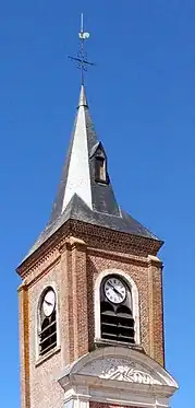 Les corniche, bandeau, encadrement de baies, pilastres et fronton du second niveau sont bordés de pierre calcaire. Le clocher est surmonté d'une flèche polygonale recouverte d'ardoises[1].