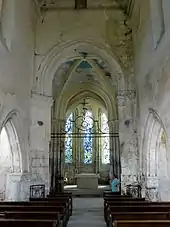 Malgré sa profondeur modeste, le chœur est subdivisé en deux travées par un doubleau intermédiaire. Celui-ci repose sur deux faisceaux d'une colonnette et de deux très fines colonnettes, de diamètre moindre que les colonnettes du transept. L'assiette des tailloirs est donc trop petite pour accueillir les formerets, qui sont reçus par des culs-de-lampe à côté des chapiteaux. Côté ouest, les culs-de-lampe ne sont décorés que de quelques nervures, alors qu'ils sont enveloppés de feuillages côté est. Il est à noter que tous les fûts de colonnettes du chœur sont appareillés, et non en délit. Leurs socles reposent sur le soubassement des fenêtres, en bas du glacis fortement incliné qui se trouve au seuil de chacune des baies. Cette disposition assez rare doit dater d'origine, à moins que le soubassement des fenêtres ait été renforcé. Elle peut s'expliquer par le souci d'éviter la montée de l'humidité dans les fûts, et deux arcs de décharge en bas du mur septentrional servent sans doute à enjamber des sources. Un troisième arc de décharge se trouve au sud de l'abside. Malgré ces précautions, la partie inférieure des colonnettes du doubleau a dû être supprimée. Le profil des ogives est différent du transept, et consiste d'un tore légèrement aigu entre deux baguettes. Le profil du doubleau est également différent, car le méplat entre les deux tores est remplacé par une gorge peu prononcée. Les clés de voûte ont été raccommodées à force de plâtre, et le décor ne subsiste qu'en partie. Dans l'abside, une tête se détache entre deux ailes ou deux feuilles, mais la clé de voûte proprement dite est nue[5].