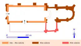 Au XIIe siècle, la façade occidentale est reprise avec percement d'une nouvelle porte et la porte latérale est percée ou reprise[6]. À la même époque l'abside est démolie et laisse place à une travée carrée formant transept prolongée par un chœur lui-même composée d'une travée et d'une nouvelle abside semi-circulaire aussi large que le chœur[2]. Ce transept, peut-être pourvu d'un bras septentrional détruit depuis[7], est surmonté d'un clocher ; ce dernier, sans doute reconstruit au XVe siècle[8] est abattu par un ouragan le [9].