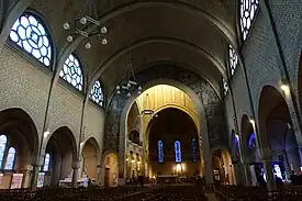 L'église a été dessinée par Émile Brunet[2]. Elle est construite en béton couvert de brique. La décoration d'inspiration Art déco (vitraux, mosaïques, sculptures, ferronnerie) est caractéristique des années 1930 et 1940[3]. Les chapiteaux sont sculptés par Pierre Seguin[4],[5],[6]. La mosaïque est l’œuvre de Auguste Labouret. Le maître-autel et la chaire ont été perdus. Les vitraux de l'abside de 1930 (sur le thème des mystères du rosaire) et des bas-côtés (qui représentent les sacrements et instruments de la Passion) sont l'œuvre de Louis Barillet. Les reliefs ont été créées par Henri Bouchard et Auguste Cornu, et les ferronneries sont l'œuvre de Raymond Subes[7]. L'église possède un orgue de 32 jeux, acheté à Dole et béni par le cardinal Emmanuel Suhard, archevêque de Paris le .