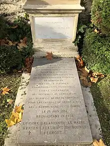 - Texte de l'inscription qui figure sur la pierre tombale : « Sous cette pierre ont été religieusement déposés les restes des fidèles qui avaient été inhumés dans l’ancienne église de St Lambert bâtie en 1342, démolie en 1854 pour cause d’utilité publique et remplacée par l’église actuelle. L’administration municipale, fidèle interprète des sentimens de vénération des habitans de cette commune pour les cendres de leurs aïeux, les a réunis dans cette tombe le . Requiescant in pace. Le curé Hersen + Les adjoints Beaumont Fremont Le maire Thiboumery ».