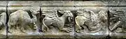 Au-dessus du portail, on peut voir une galerie découverte reliant les deux tours, entre la rose à douze compartiments et une balustrade formée de vingt arcades trilobées. Dessous la balustrade a été sculptée en ronde-bosse une frise historiée formée par 21 pierres représentant des sujets difficiles à interpréter pour certains : homme, taureau, aigle, lion qui peuvent représenter le tétramorphe, homme ailé, sirène, dromadaire, une scène de chasse, peut-être la légende de Saint-Hubert, ...