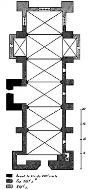 La tour nord de la façade occidentale a servi de clocher jusqu'à la Révolution. Elle servait aussi pour la défense de l'église. La tour sud est presque carrée (5 x 5,50 m de côté) et s'élève à près de 30 m. Elle est pleine en partie basse. Elle comprend quatre salles en partie haute séparées par des planchers. On y accède par un escalier à vis de 0,83 m de large placé dans un angle de la maçonnerie et dont l'entrée se fait par l'intérieur de l'église.