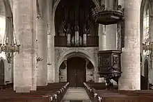L'orgue est situé sur une tribune en pierre de section carrée au revers de la façade occidentale. La tribune est ouverte sur les bas-côtés par deux arcades ogivales et soutenue par de larges piliers cylindriques, les écoinçons sont sculptés de figures en bas-relief.