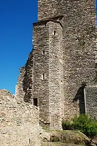 Sa face orientale est renforcée par de courts contreforts tandis que sa face méridionale présente une tourelle d'escalier polygonale percé de meurtrières.