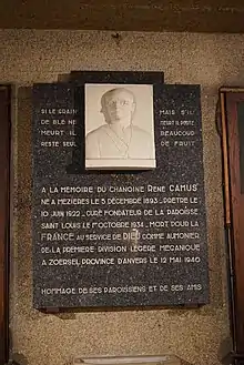 La rue, en face de l'église, s'appelle « chanoine René Camus », du nom de René Jean Victor Gustave Camus, né à Mézières en 1893, mort pour la France le [2]. Il fut ordonné prêtre en 1922, vicaire à Mézières, puis à Saint-Remi de Reims, en 1926, et fut le premier curé de la paroisse Saint-Louis pendant huit ans. Mobilisé en 1940 comme aumônier divisionnaire de la première Division légère mécanique, il mourut dans la forêt d’Oostmalle à Zoersel, près d’Anvers, en Belgique. Il fut nommé chanoine honoraire.