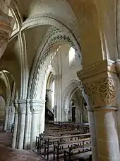 La totalité de la nef et de ses bas-côtés est voûtée sur croisées d'ogives dès l'origine, c'est-à-dire depuis 1140 environ. Ce fait est assez inhabituel pour une église romane, et l'absence de formerets (sauf dans la première travée) a longtemps fait penser que les voûtes auraient été ajoutées postérieurement à l'achèvement de l'église. Un examen précis des finitions montre que ce n'est pas le cas. De même, si les piliers peuvent paraître remaniés, il ne s'agit en réalité que de traces de maladresses lors de la construction, qui ont parfois nécessité des corrections. L'appareil des voûtains est très régulier, et les voûtes sont déjà en arc brisé. Le profil des ogives est de deux boudins séparés d'une arête. Les clés de voûte sont minuscules et ne concernent que le croisement des arêtes centrales. Les doubleaux se composent d'un rang de claveaux aux arêtes biseautées. Ils retombent sur les chapiteaux du second ordre, supportés par des demi-colonnes engagées dans les dosserets des piliers au noyau cruciforme. Ces chapiteaux s'accompagnent de chaque côté d'un chapiteau plus petit placé en biais, accueillant les ogives, et supporté par une colonnette logé dans l'angle entre le dosseret et le mur. Quant aux formerets de la première travée, ce ne sont que de simples rangs de claveaux engagés dans les murs, au même profil que les doubleaux, et en l'absence de supports dédiés, ils s'arrêtent nets au niveau des chapiteaux. Les formerets ne pénètrent donc pas dans les ogives ni partagent leurs chapiteaux, comme ce sera le cas à la période gothique.