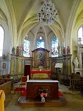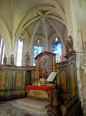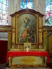 - Le retable du maître-autel est en bois polychrome et partiellement doré. Ses dimensions n'ont pas été prises. Sa vocation est de mettre en valeur le tableau de la Résurrection signalé ci-dessus. Il se compose, pour l'essentiel, d'un cadre en anse de panier, flanqué de deux larges montants décoré de panneaux d'un style rocaille épuré, et surmonté de deux pots-à-feu, le tout peint en faux-marbre rouge et blanc. À l'instar du tableau, le retable devrait dater de 1779. Il est inscrit depuis [24], et a été restauré depuis.