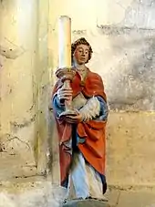 - La statuette de sainte Barbe, actuellement placée sur l'autel de sainte Anne, est en bois anciennement polychrome, mais repeinte en gris, de sorte à suggérer une sculpture de pierre. Elle mesure 76 cm de hauteur, et date du XVIe siècle. Son classement est intervenu en [20].
