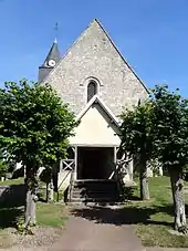La façade occidentale et les élévations latérales de la nef sont parfaitement homogènes. Elles sont appareillées en petits moellons de silex noyés dans un mortier, la pierre de taille étant réservée aux contreforts, aux encadrements des baies, et au portail. Deux contreforts orthogonaux cantonnent les deux angles de la façade. Chaque mur gouttereau dispose en outre d'un contrefort médian. Ses contreforts se retraitent par un fruit à deux ou trois assises du sol, puis à un tiers de leur hauteur, et s'amortissent par un glacis formant larmier. Conformément au nombre de contreforts, qui définissent deux travées, chaque mur gouttereau est ajouré de deux lancettes simples. En tous points analogues à la baie occidentale alignée au-dessus du portail, elles sont surmontées d'un bandeau doublement biseauté en forme de sourcil, qui se prolonge latéralement sur une courte section au niveau des impostes. Eugène Müller dit que « la façade de l'église est d'une simplicité qui démontre que le bon goût n'exige point de grands frais »[5]. Tout l'effort décoratif se focalise sur le portail, qui est surmonté d'un tympan plein servant en même temps de linteau, et d'une double archivolte torique, complétée par un rang de têtes de clous ou pointes-de-diamant. Par le biais de tailloirs au profil d'une plate-bande, d'un listel et d'un cavet, cette archivolte repose sur deux paires de colonnettes à chapiteaux logées dans des angles rentrants. Leurs chapiteaux sont sculptés de crochets stylisés, malheureusement cassés, et leurs fûts en délit sont d'une minceur remarquable. Au niveau des chapiteaux, les piédroits intérieurs du portail sont munis d'une frise de feuilles de chêne. Le porche qui devance le portail est moderne. Il empêche d'apprécier la façade dans son intégralité. Reste à signaler une porte bouchée de facture romane au nord de la nef. En subsistent les montants, le linteau et le tympan monolithique non décoré, et l'archivolte appareillée, également sans décor.