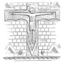 - Le Christ en croix en très bas-relief, provenant du pignon de la façade occidentale et monté sur le mur occidental avant le classement en 1912, date du dernier quart du XIIe siècle. Il se compose de plusieurs éléments en pierre calcaire taillée et polie, et mesure 192 cm de haut et 150 cm de large. Une croix semblable, mais sans Christ, figure toujours sur la façade de la Basse-Œuvre de Beauvais. Une autre existait jadis à Bresles[32].