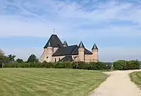 La façade orientée à l'ouest et le haut donjon carré soutenu par deux contreforts.