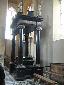 Mais un des éléments les plus remarquables à l'intérieur est le mausolée de Claude de Joyeuse, comte de Grandpré, et de son épouse. Claude de Joyeuse est décédé en 1629. Il avait été capitaine au sein des Ordonnances du Roi, conseiller des rois Henri IV et Louis XIII, gouverneur de Mouzon et de Beaumont en Argonne. Il avait abjuré sa religion protestante. Le tombeau en marbre noir est placé sous un dais soutenu par quatre colonnes ioniques. Des statues, mutilées pendant la Révolution française, sont disposées sur la table supérieure, aux angles de l'entablement, et représentent la fidélité, la foi, la tempérance et le courage. Les statues de marbre blanc représentant Claude de Joyeuse et sa femme ont été brisées lors des événements révolutionnaires. On peut lire sur le mausolée : Tout ce que la terre nourrit - Finalement elle le pourrit.