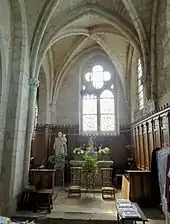 Il en va de même de la plupart des chapiteaux de la seconde travée du chœur, sauf un, qui présente uniquement des feuilles de chêne. Tous les chapiteaux du chœur ont bénéficié d'un décor polychrome, qui semble subsister d'origine dans la première travée où il est presque effacé, et qui a été refait dans la seconde travée. Les arcades autour de cette travée et ses ogives, de profil torique piriforme, ont fait l'objet du même traitement, ainsi que la petite clé de voûte sous la forme d'une couronne de feuillages. Par ailleurs, un seul chapiteau a été remplacé par un culot fruste, à savoir de l'angle sud-ouest. Dans l'abside, les fenêtres occupent pratiquement toute la largeur des trois pans de mur. Leur remplage est agrémenté de moulures toriques, même sur la fenêtre de droite, où cette mouluration manque vers l'extérieur. Seuls les meneaux de la baie d'axe conservent leurs petits chapiteaux. Ils sont situés plus hauts que les chapiteaux des ogives, qui se rapprochent beaucoup du soubassement des fenêtres et soulignent la faible hauteur sous voûte, diminuée encore par l'estrade du maître-autel. Les vitraux du XIXe siècle présentent des motifs ornementaux avec prédominance du verre blanc. Seul le médaillon de la baie d'axe est figuratif et illustre la descente de croix. Un lambris de demi-revêtement de style néogothique couvre les soubassements des fenêtres et la partie inférieure des murs. D'un bel effet, il préserve les colonnettes gothiques, qui ont souvent été coupées dans de pareilles circonstances. Le maître-autel avec son tabernacle et l'autel servant aux célébrations sont également néogothiques, mais sans l'exubérance et la prolifération de détails qui est souvent propre à ce style[4],[5],[6],[7].