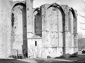 Une église est construite au XIIe siècle avec une tour-clocher défensive. Au XIIIe siècle, l'église est reconstruite plus au sud, côté est du cloître, en élargissant le nef unique. L'abside à 7 pans du chœur avec cinq chapelles entre les contreforts a été construite un siècle plus tard.