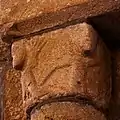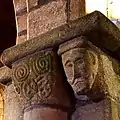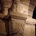 Les chapiteaux romans sont répartis sur les huit colonnes des quatre premières travées occidentales. Ces chapiteaux sont fréquemment associés à des modillons sculptés. À l'exception d'un chapiteau refait, l'ensemble des chapiteaux et des modillons sont datés du XIIe siècle[6], ils représentent des visages, des têtes d'animaux, parfois des personnages entiers et pour quelques-uns d'entre eux des scènes historiées.
