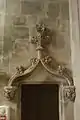 Insérée sur un mur extérieur, on peut voir une pierre tombale armoriée sur laquelle figurent les armes de Pierre Le Roux : de gueules au chevron d'or accompagné de trois roses d'argent, 2 et 1, écuyer, sieur de Giberpray, mort le et de R. Françoise Grip de Savigny[9].
