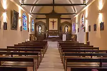 L'intérieur de l'église est éclairé par six fenêtres (trois de chaque côté) occupées par des vitraux. La voûte de l'église est en plein cintre.